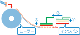 • ロボットアームでキャップとボディの段差に引っかけてローラーへ移動させ、オフセット印刷(ゴム版転写・ブレードによるインク掻き取り)を行います。