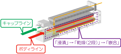 ライン先端から「浸漬」「乾燥」「嵌合」と流れてキャップ・ボディが成型されます。