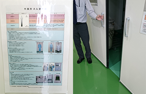 - 製造エリアと廊下で差圧設定を行い(圧力の差で気流を生むことで)、髪の毛などの異物は廊下へ流すようにしています。(クリーンルーム・差圧計管理)