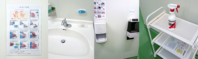 細かい手洗い手順を作成し、タイマー(20秒)の手洗いが実践されています。見学者も同様です。