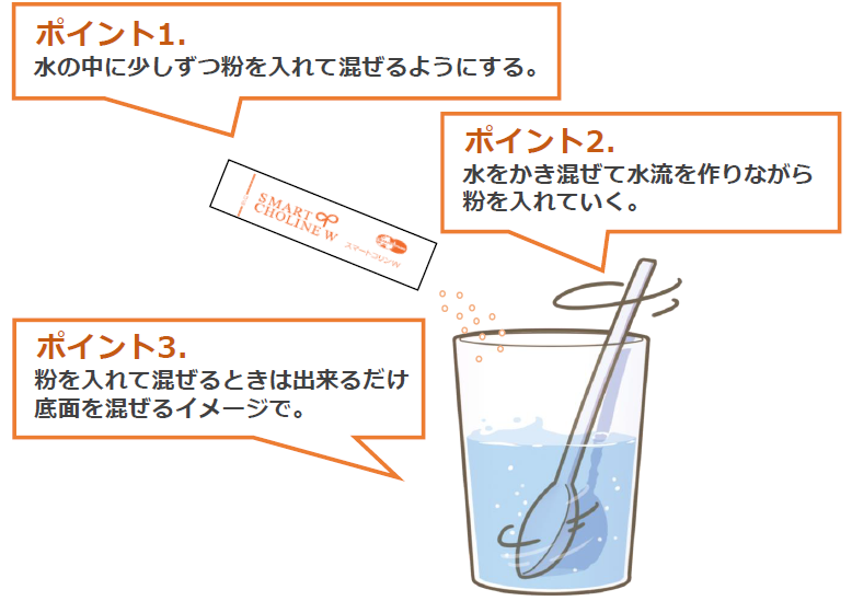 『スマートコリンW』に配合されている、α-GPC、ビタミンD、ビタミンEは水に溶けにくい性質を持っています。